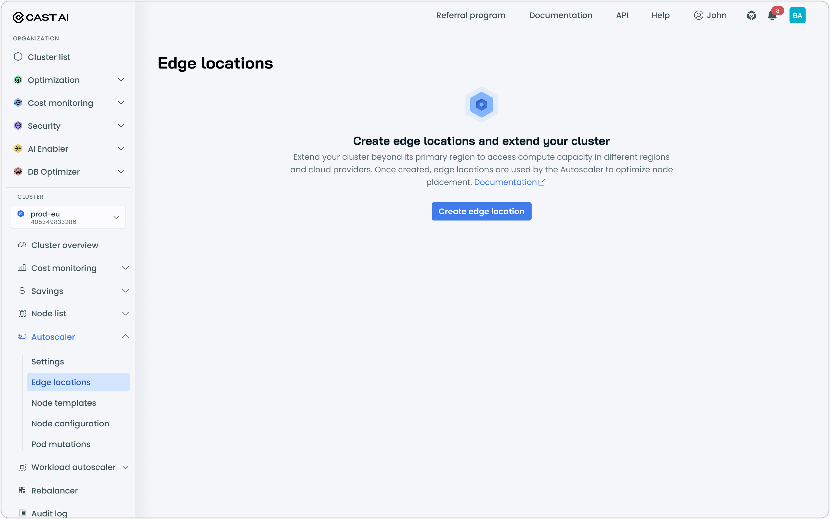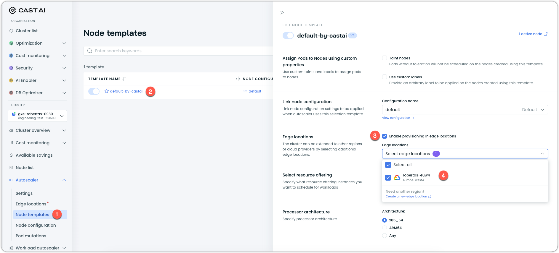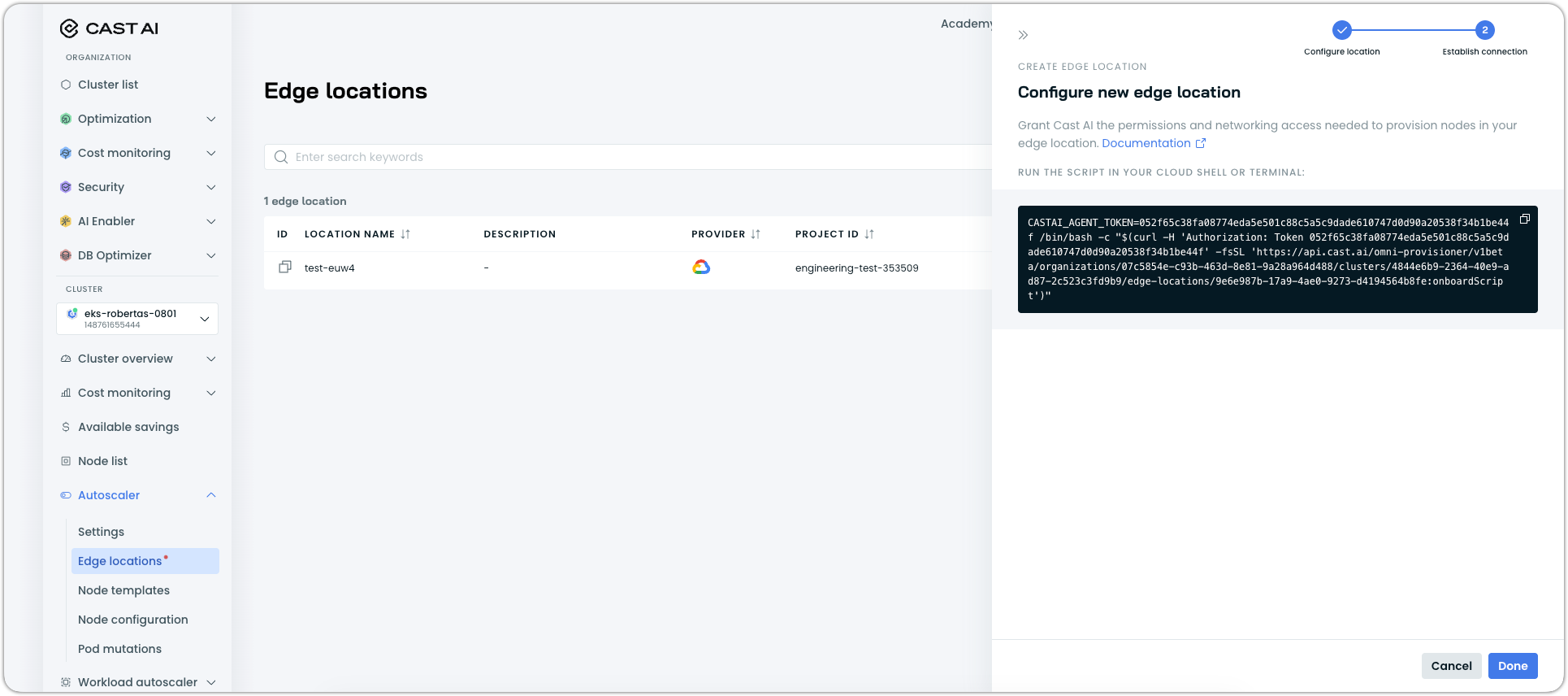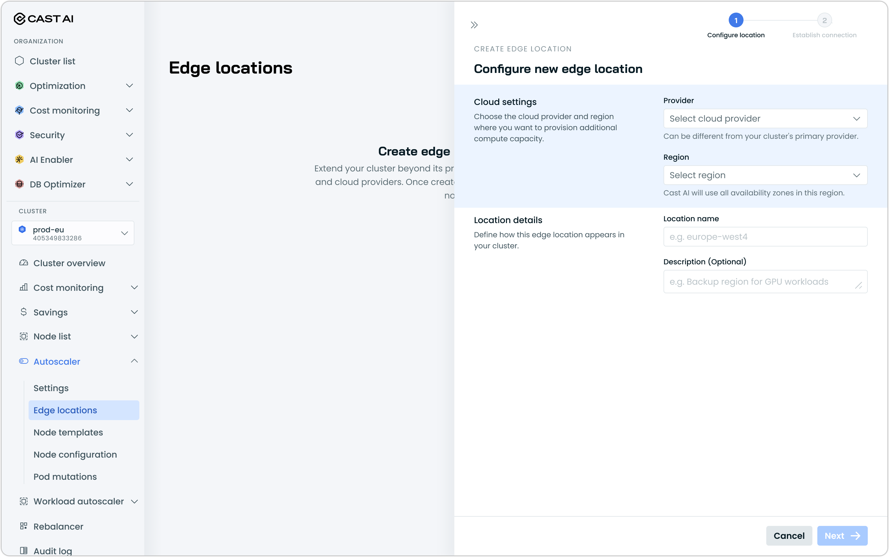 - In the Cast AI console, navigate to Autoscaler → Edge locations