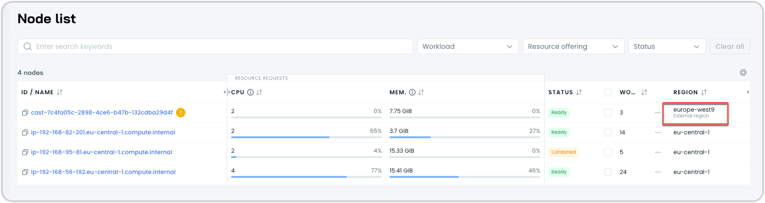 In the Cast AI Console, edge nodes are identified in the Nodes list via an additional External region label in the Node list: