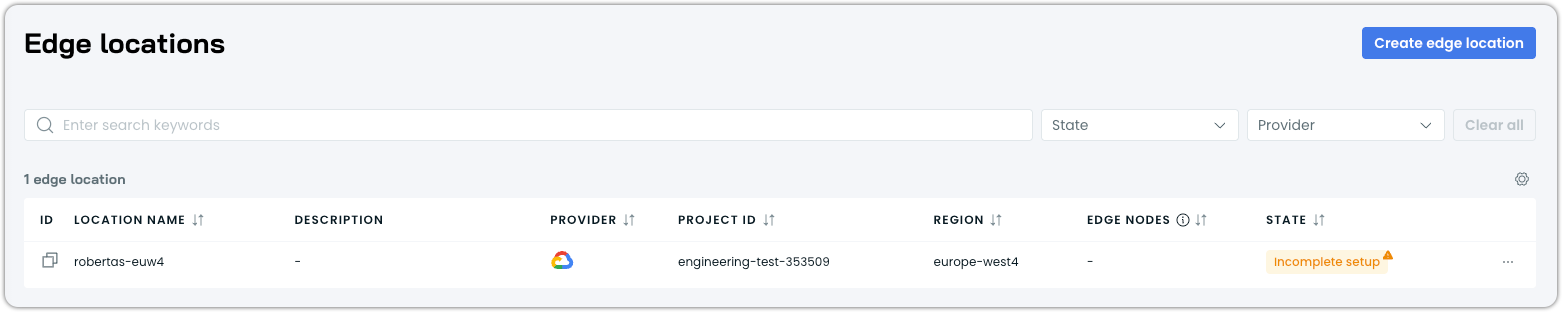 Why "Incomplete setup"?An edge location shows Incomplete setup until it's added to at least one node template. This is expected behavior.