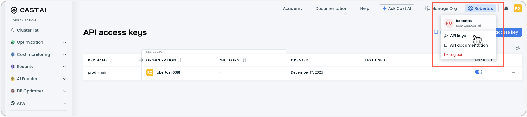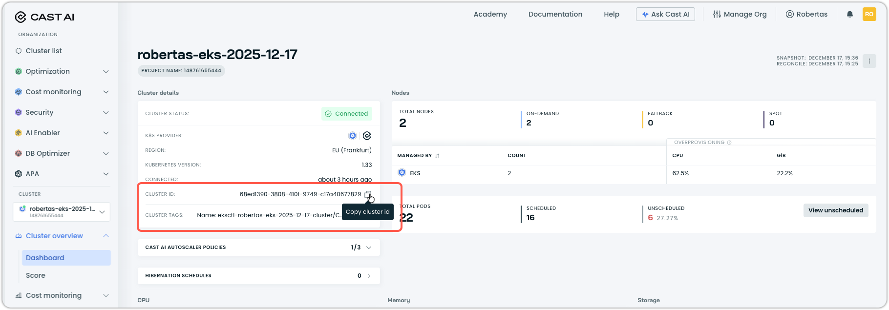 ${CASTAI_API_KEY}and${CLUSTER_ID}with your actual values. You can find these in the Cast AI console under User → API keys and in your cluster's settings.
