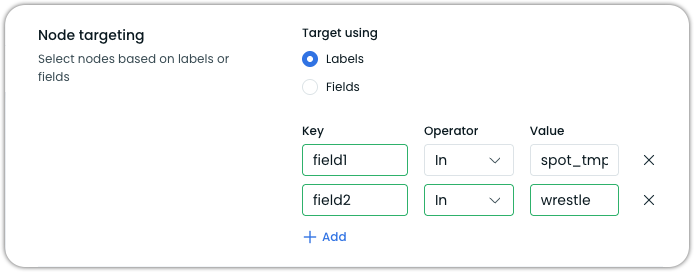 Field-based targeting provides an alternative method when label-based selection isn't sufficient. When selecting Fields, you can target nodes based on their Kubernetes field values rather than labels.