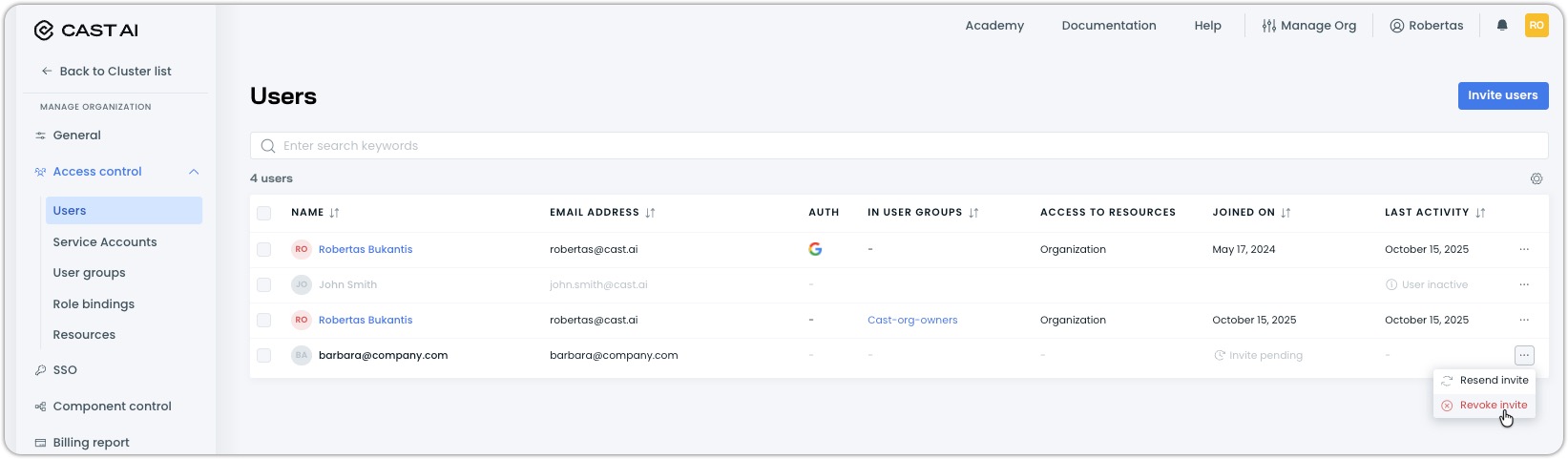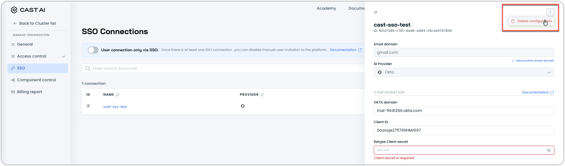 WarningDeleting your SSO connection will permanently remove all users who were provisioned through SSO from Cast AI. If you have SSO Group Sync enabled, all synced groups will also be removed.