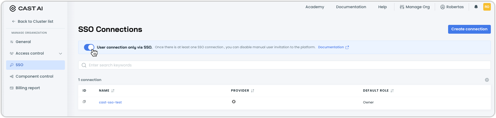 Now, you can set up a connection using Cast AI console. Go to Organizational profile - > SSO in the Cast AI console.