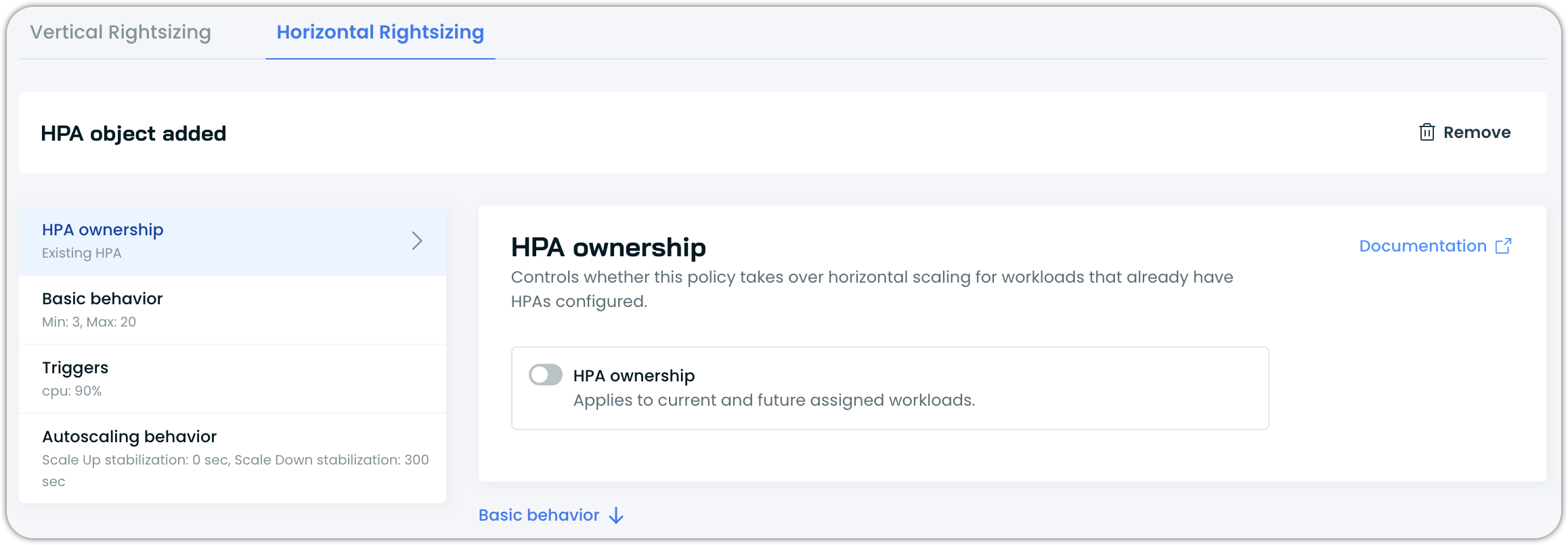 - In the policy's Horizontal Rightsizing tab, locate the HPA ownership section