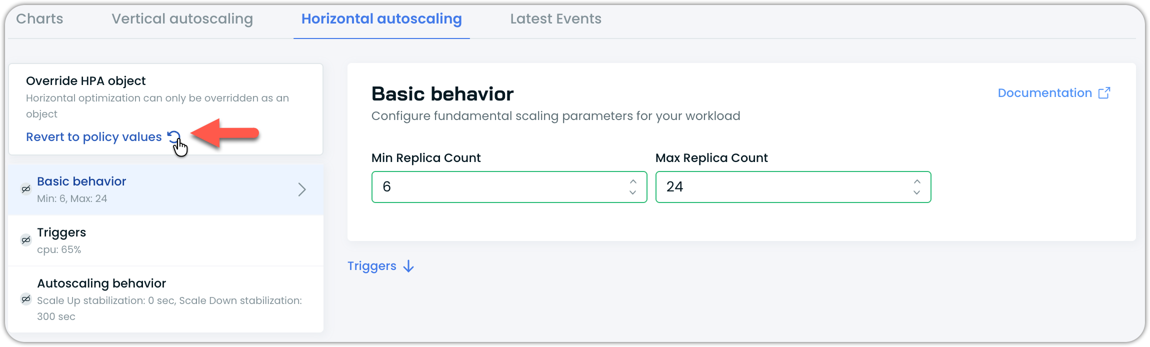 kubectl describe hpa <workload-name> -n <namespace>After reverting, confirm the HPA reverts to the policy's values (or is removed if the policy has no HPA configured):