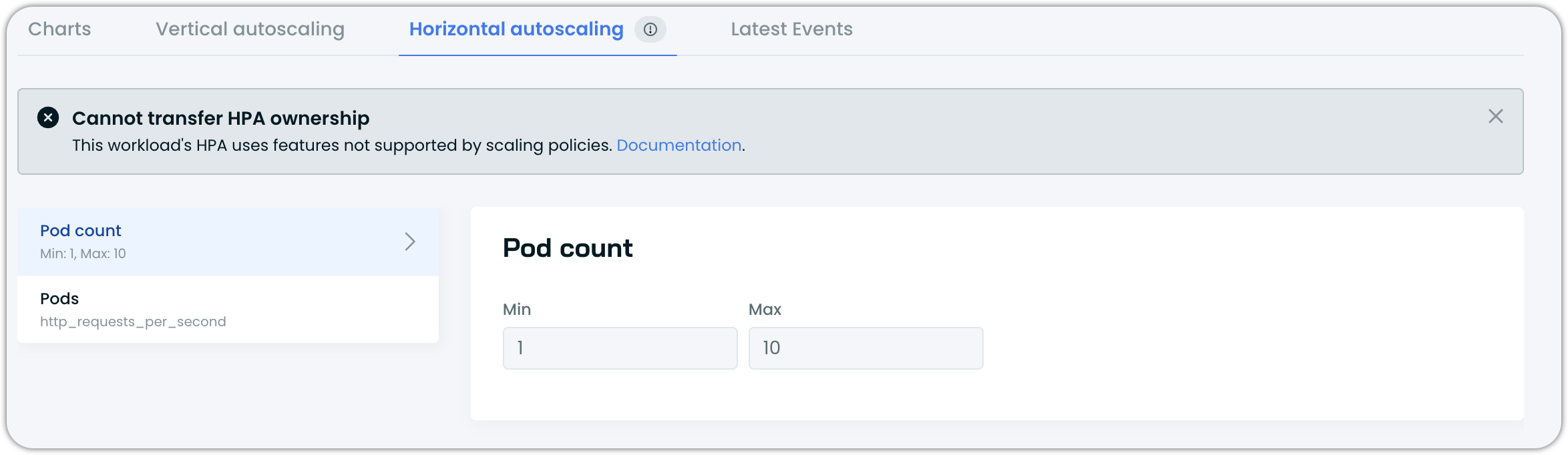 Workloads whose HPAs use unsupported features are skipped. The Cast AI console displays a Cannot transfer HPA ownership message on these workloads, explaining that the HPA uses features not currently supported by scaling policies. These workloads retain their existing HPA and are not affected by the policy's horizontal autoscaling settings.