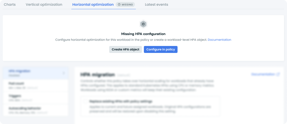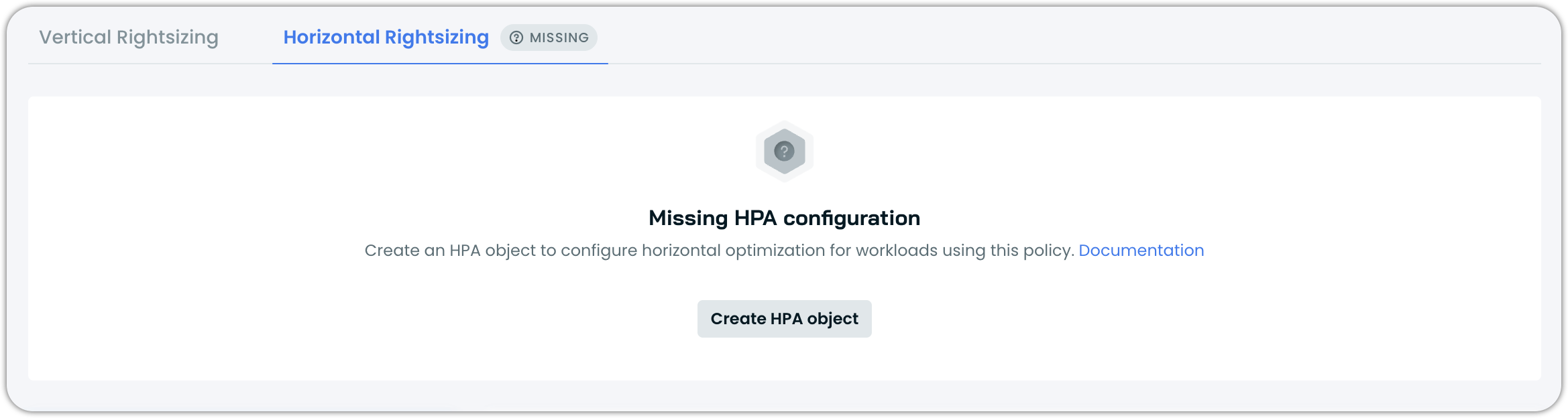 If the workload's scaling policy does not have HPA configured, the Horizontal autoscaling tab shows a Missing HPA configuration message. The available options depend on the policy type: