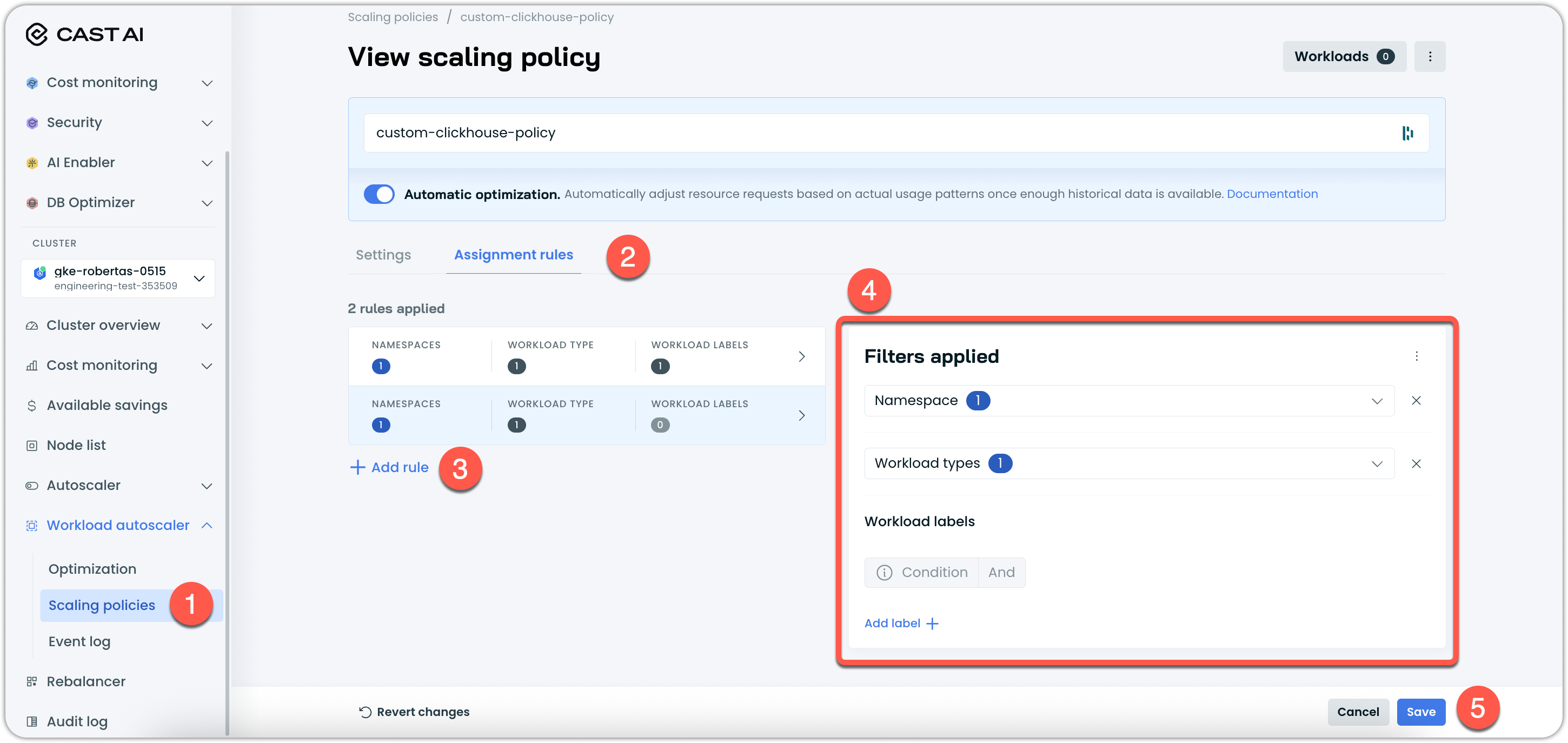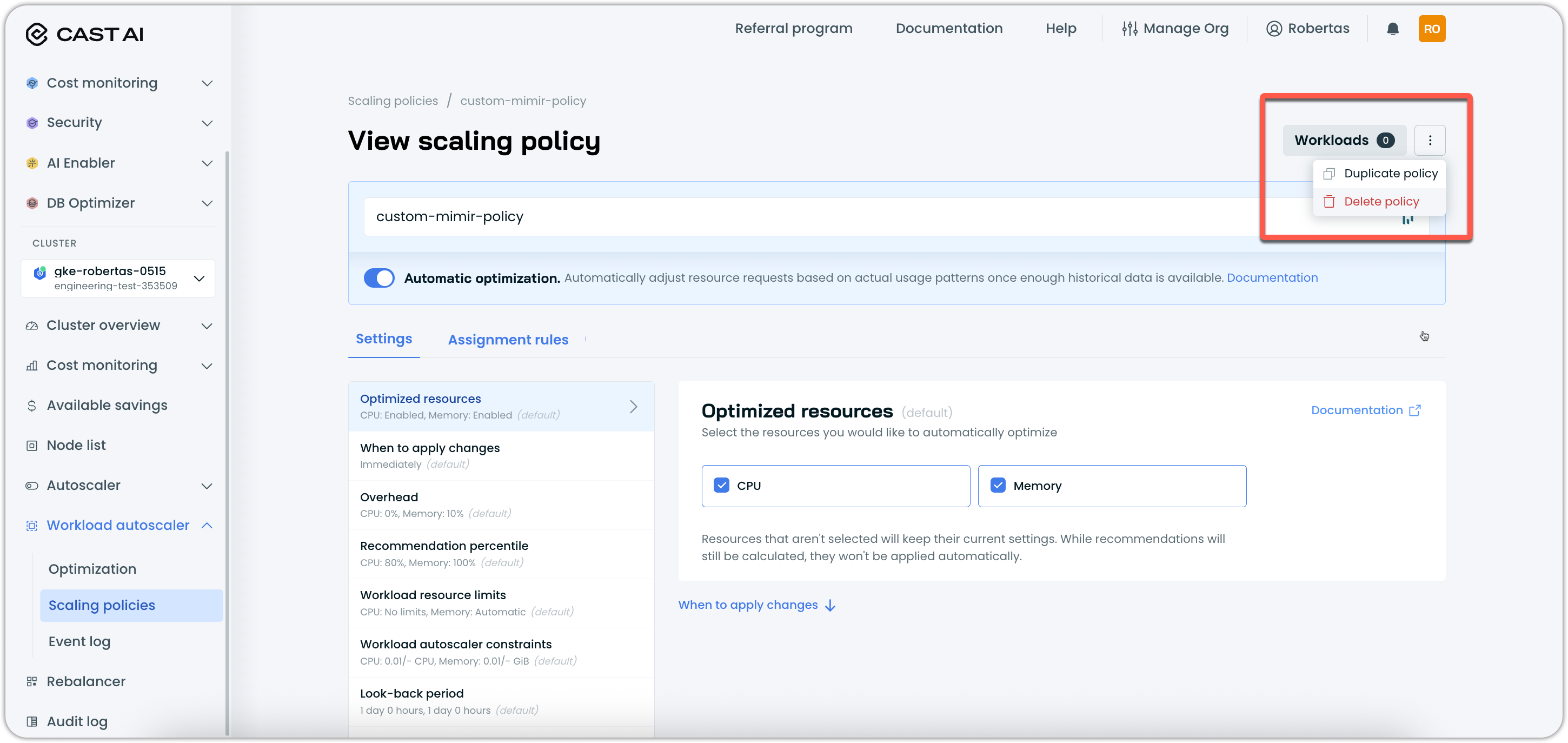workloads.cast.ai/configurationwithscalingPolicyName - Direct UI assignments – Policies manually assigned through the Optimization page in the Cast AI Console