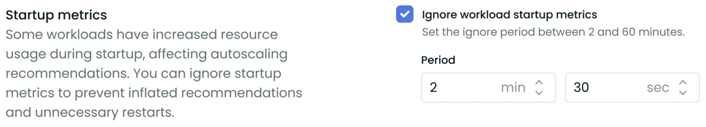 The startup period duration comes from the workload's configured startup period. For example, if a workload has a 5-minute startup period configured, the startup phase resources are applied for 5 minutes before the in-place resize to the optimized recommendation.