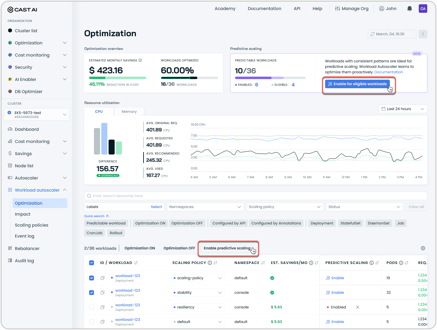 The Cast AI console provides an intuitive interface for configuring workload optimization settings at both the scaling policy and individual workload levels. Through the web-based UI, you can easily adjust autoscaling behavior, set resource constraints, configure recommendation thresholds, and monitor optimization performance in real-time.