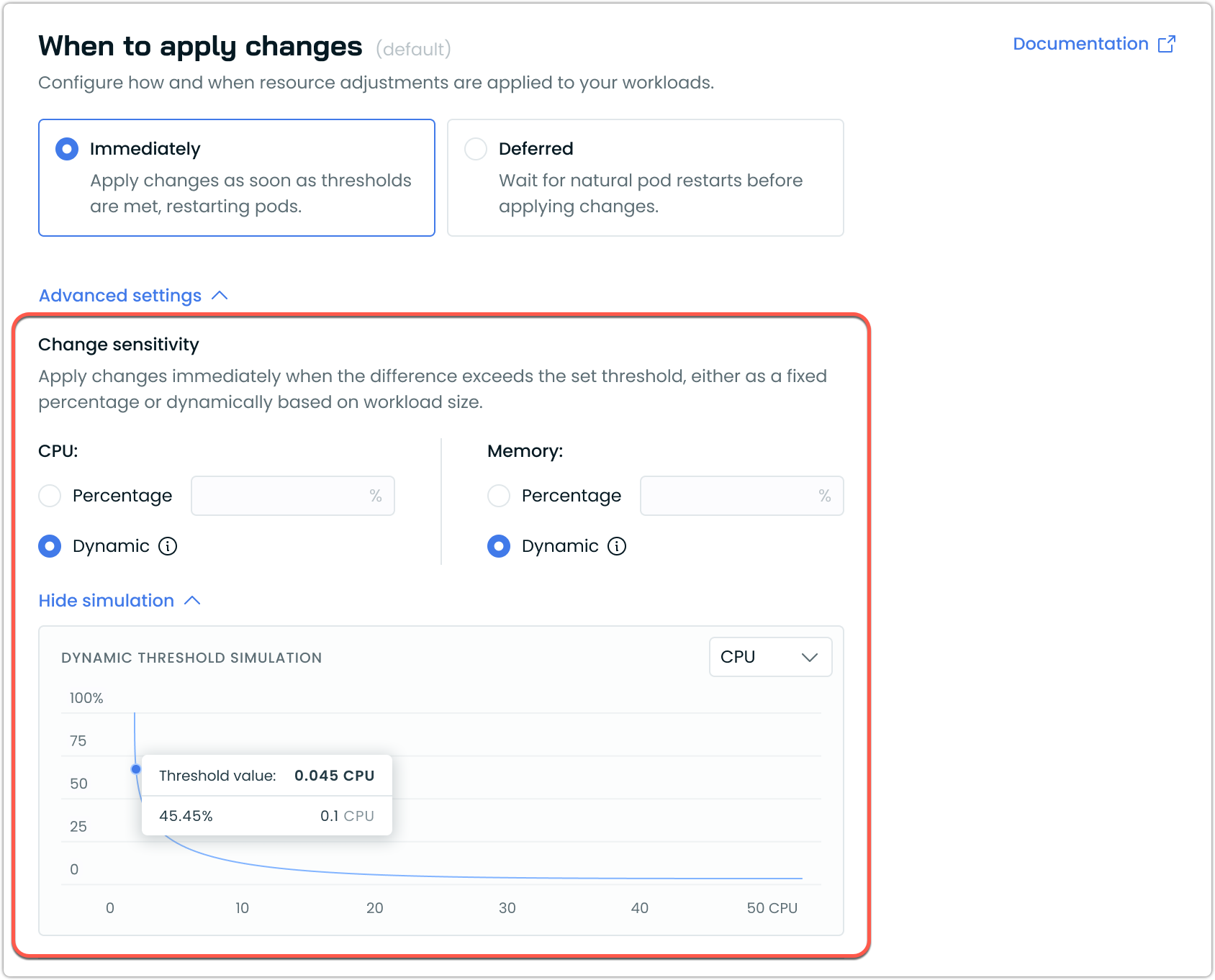 - Applies resource optimizations either during natural Pod restarts or immediately (including in-place resizing) based on your scaling policy