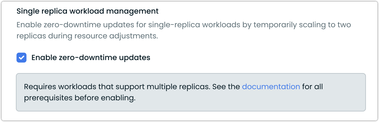 --set workloadWhitelistingEnabled=trueWith whitelisting enabled, workloads require the workload-autoscaler.cast.ai/enabled: "true" label to have recommendations applied. See Whitelisting mode for details.